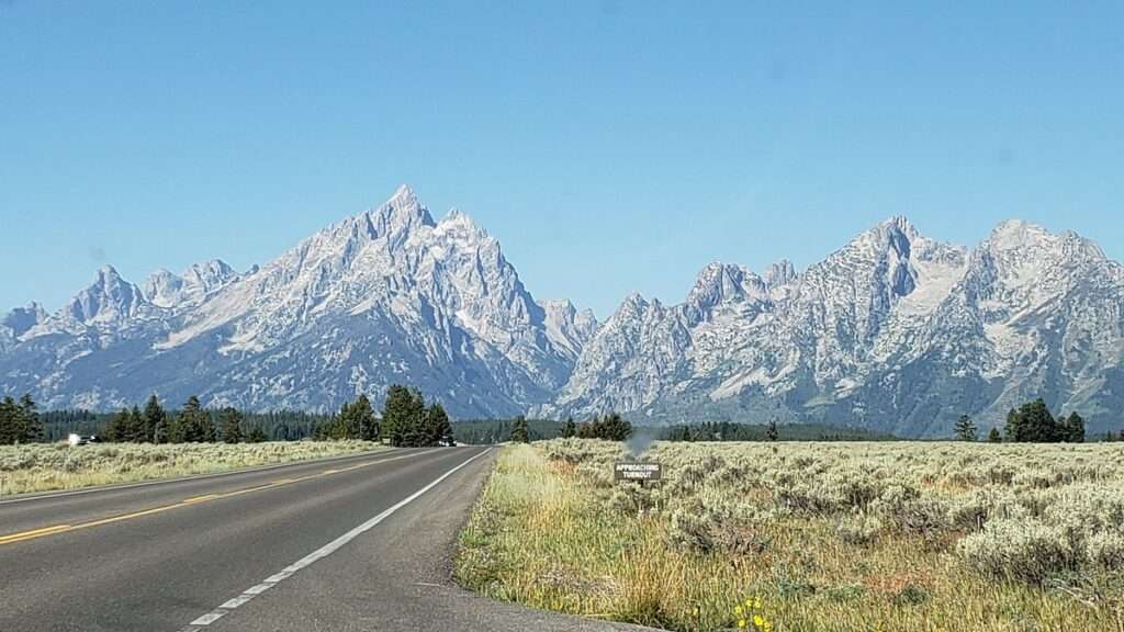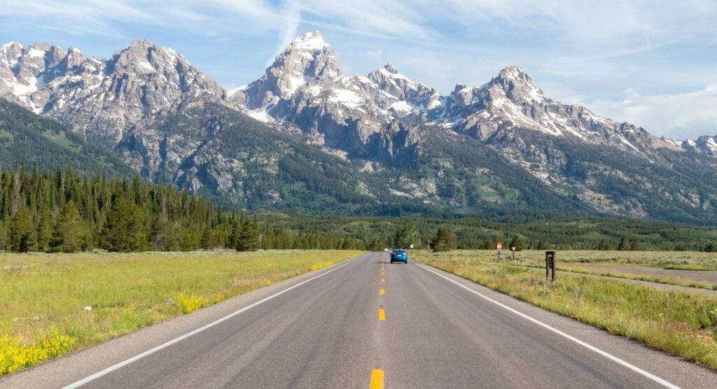 Highway going towards Teton Range in Grand Teton National Park