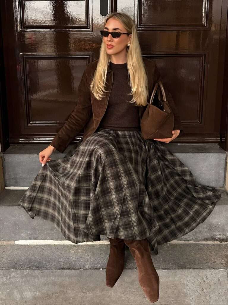 She’s wearing a rich brown sweater paired with a suede jacket, creating a warm, luxurious base. The standout piece is the full plaid midi skirt, which adds beautiful movement and a timeless, feminine feel. Finished with tall suede boots, slim sunglasses, and a matching brown handbag, this look is polished, nostalgic, and perfect for a cozy, picturesque road trip moment.