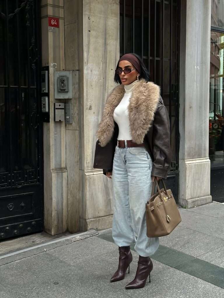 This Luxe Street Style Layers Road Trip Outfit brings a high-fashion twist to travel-ready dressing. She’s wearing a fitted white turtleneck paired with relaxed light-wash jeans, creating the perfect balance of sleek and effortless. The oversized brown leather jacket with a dramatic fur collar adds instant glamour, while the burgundy heeled boots elevate the entire look. Finished with a taupe structured handbag, chic sunglasses, and a brown headscarf, this outfit feels polished, bold, and runway-worthy—yet still comfortable enough for a stylish road trip moment.