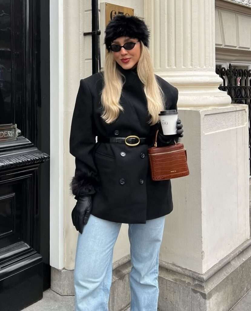 She’s wearing a structured black double-breasted coat belted at the waist, giving the outfit shape and a refined silhouette. The fur-trimmed sleeves and matching black fur hat add a luxurious, winter-ready touch, while the light-wash jeans keep the look balanced and casual. Finished with black gloves, narrow sunglasses, and a rich brown mini bag, this outfit feels elegant yet practical for a road trip in chilly weather.