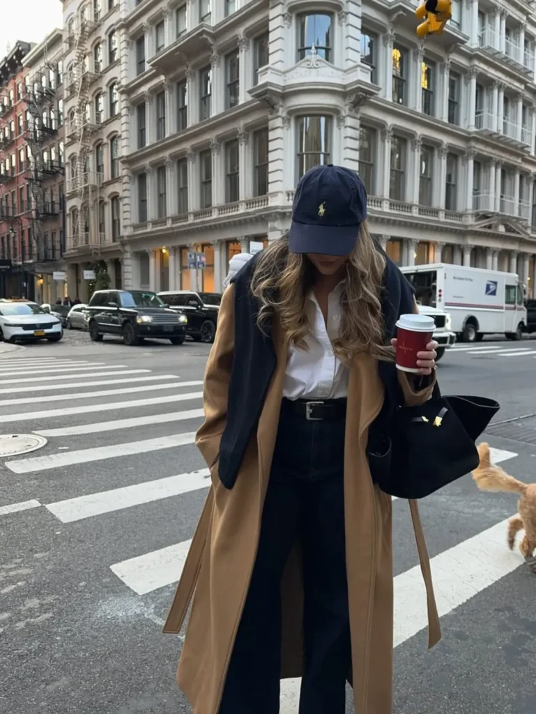 This Classic Road Trip Outfit captures that effortless, cool-girl city-to-highway vibe. She’s wearing a long camel coat layered over a crisp white button-down, giving the look a polished yet relaxed feel. The navy sweater casually draped over her shoulders adds dimension and warmth, while the dark wide-leg jeans keep everything sleek. A navy baseball cap and structured black handbag complete the look, making it perfect for grabbing coffee before hitting the road.