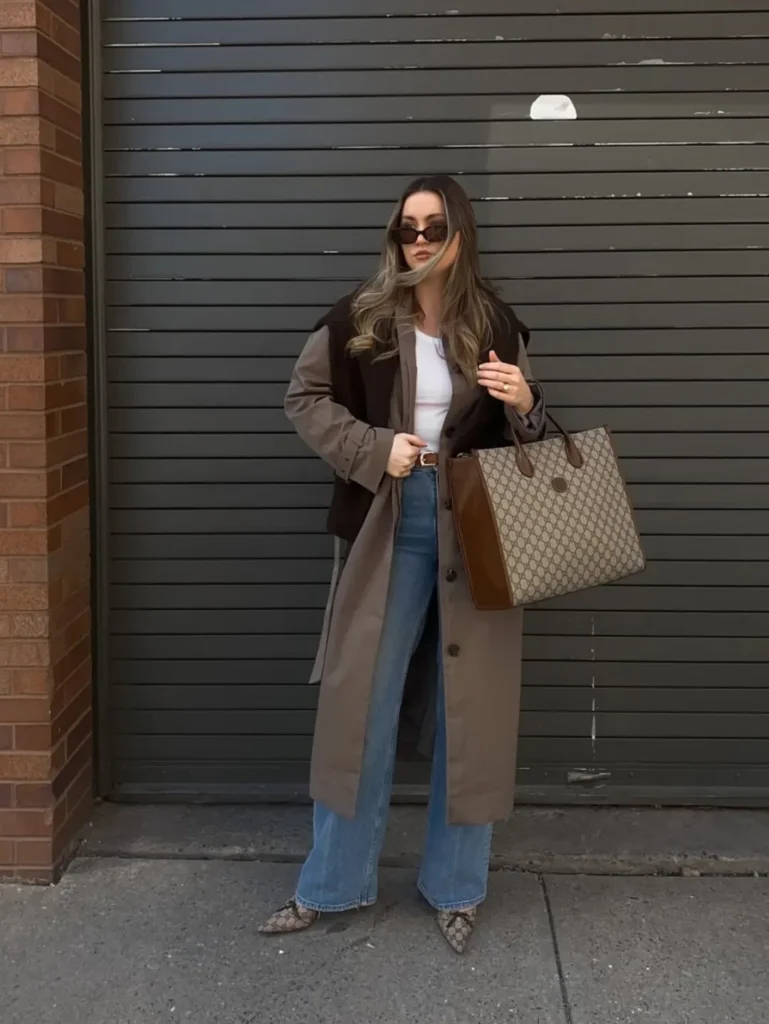 This Chic Neutral Layers Road Trip Outfit blends comfort with elevated everyday style. She’s wearing a long taupe trench coat over a white fitted tee, paired with light-wash wide-leg jeans for that laid-back, travel-ready vibe. The dark sweater draped over her shoulders adds warmth and a sophisticated touch, while the oversized designer tote makes it perfect for carrying road trip essentials. Finished with snakeskin pointed-toe shoes and sleek sunglasses, this look is polished, practical, and effortlessly stylish.