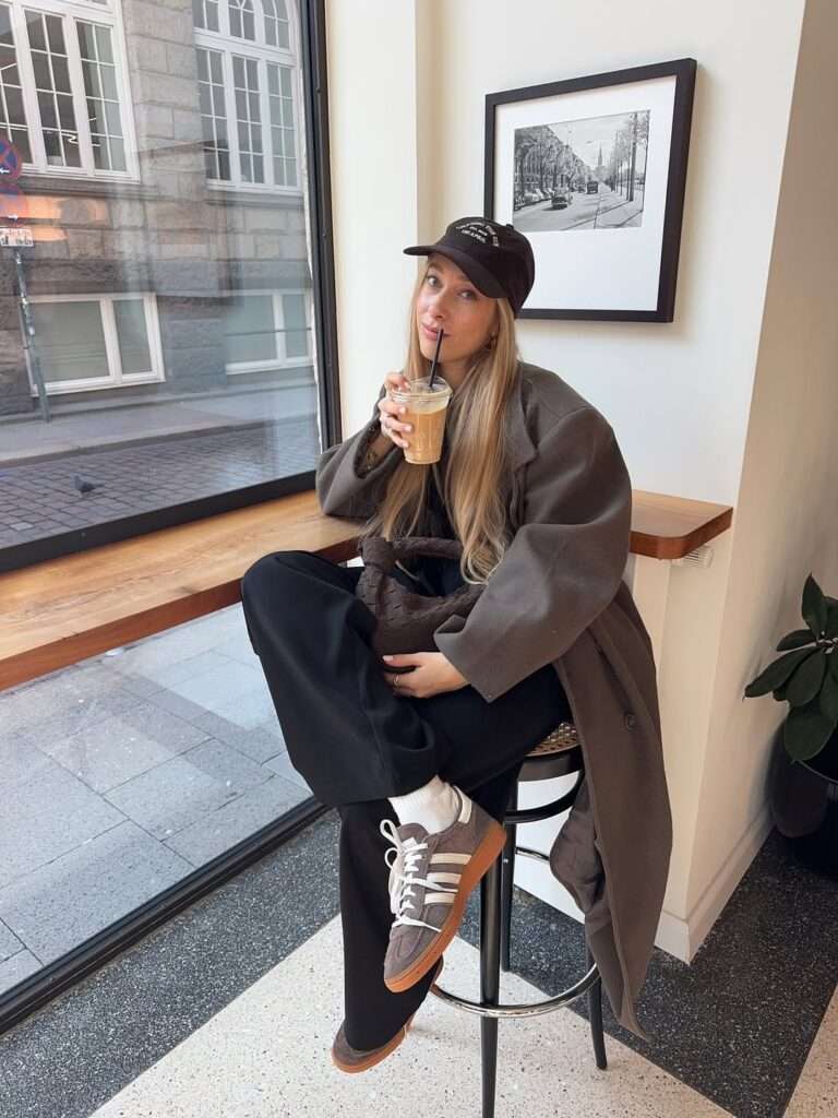 She’s wearing an oversized charcoal coat layered over a black top and wide-leg pants, creating a warm, easygoing silhouette. The chunky white socks paired with taupe Adidas sneakers add a sporty, effortless touch, while the black baseball cap brings in that casual road-trip aesthetic.