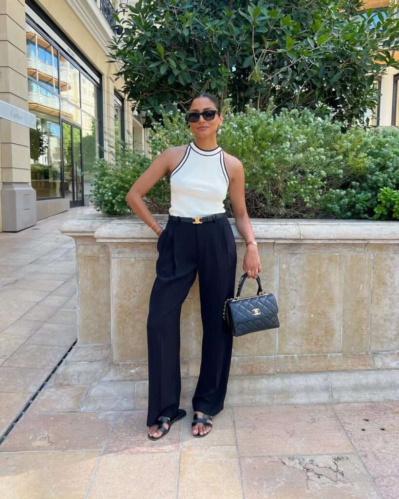 This outfit is sleek, sharp, and incredibly flattering for spring. The white sleeveless top with black trim creates a refined contrast, and the high-waisted black trousers make the whole look feel elevated and elongated. Small details like the black belt, quilted handbag, and flat black sandals keep the outfit coordinated without overdoing it. This is the kind of look that works for lunch, shopping, or a stylish daytime meeting.