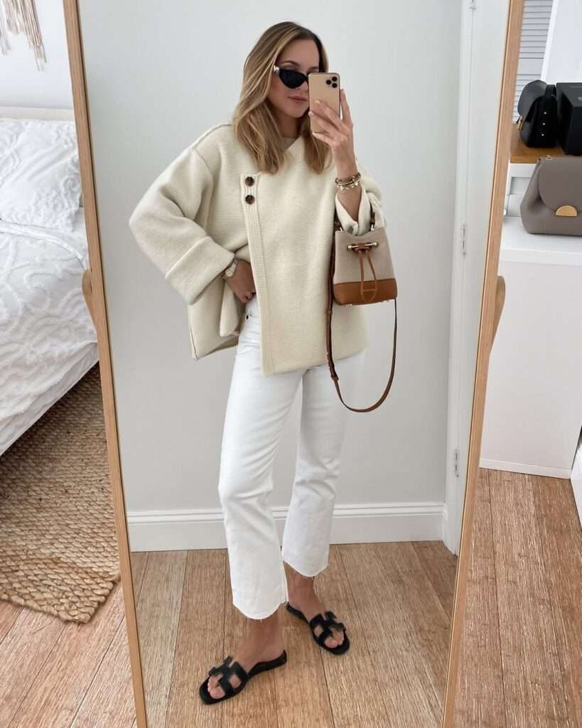 This first outfit is the definition of a clean spring neutral look. The oversized cream knit top with statement side buttons feels soft and relaxed, while the cropped white jeans keep the silhouette crisp and modern. The black flat sandals add contrast without making the outfit feel heavy, and the tan bucket bag warms everything up beautifully. It is simple, polished, and perfect for spring days when you want to look expensive without trying too hard.