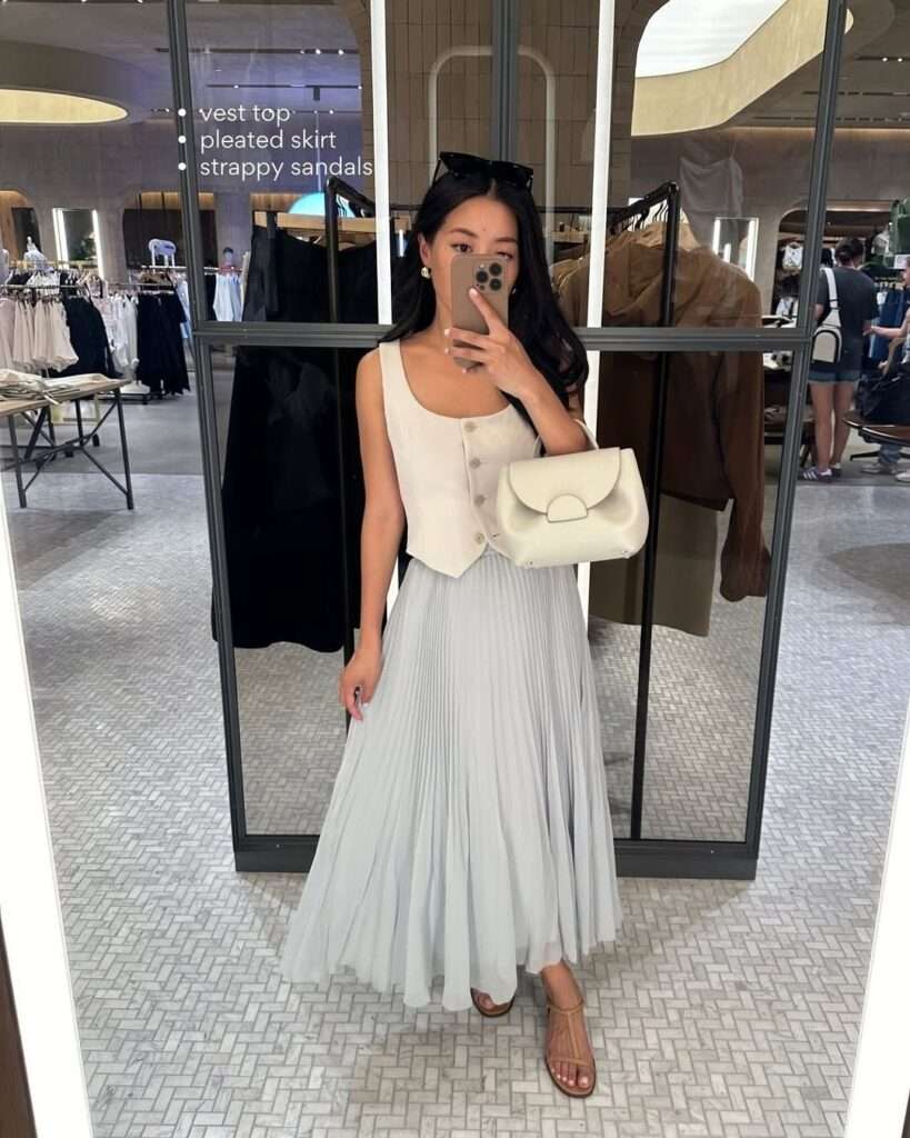 This look feels airy, graceful, and very feminine. The cream button-front vest gives the upper half structure, while the soft pleated maxi skirt adds movement and a romantic spring feel. The strappy sandals and cream handbag keep the outfit light and elegant without distracting from the silhouette. It is a beautiful outfit for spring lunches, garden events, or any day when you want something refined but still easy.