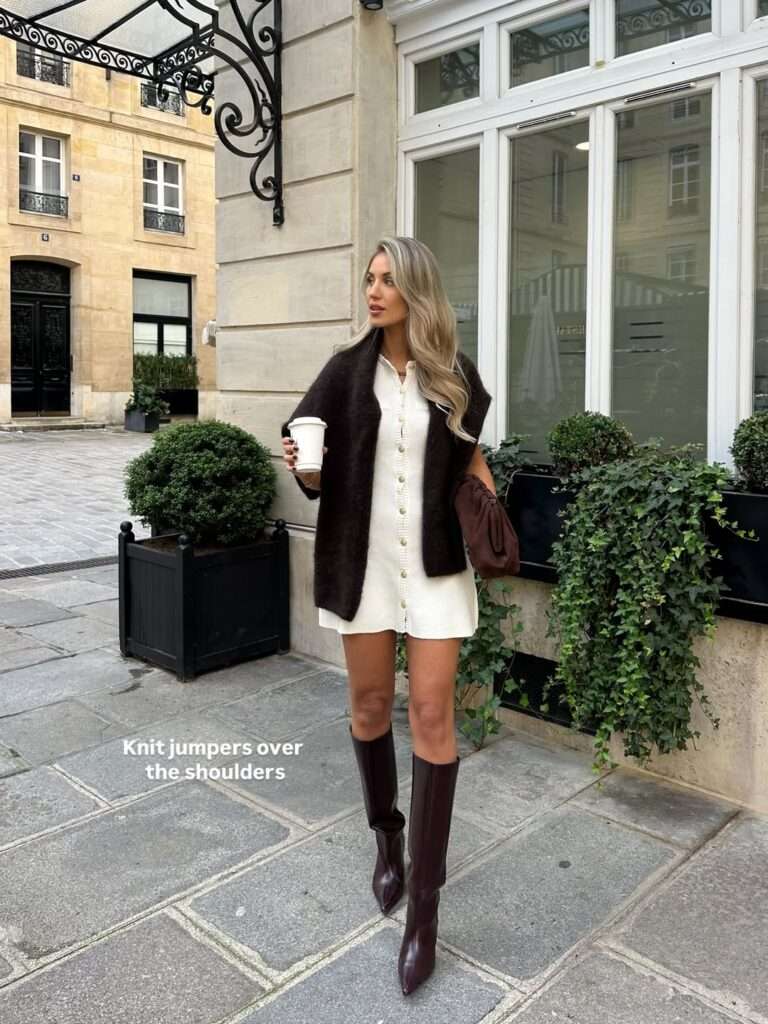 This outfit feels like early spring dressing done exactly right. The cream button-front knit mini dress is simple and flattering, while the dark brown knit draped over the shoulders adds texture and makes the look feel more styled. The tall brown boots ground the outfit and give it a stronger seasonal presence. It is cozy, polished, and ideal for those in-between spring days that still need a little warmth.