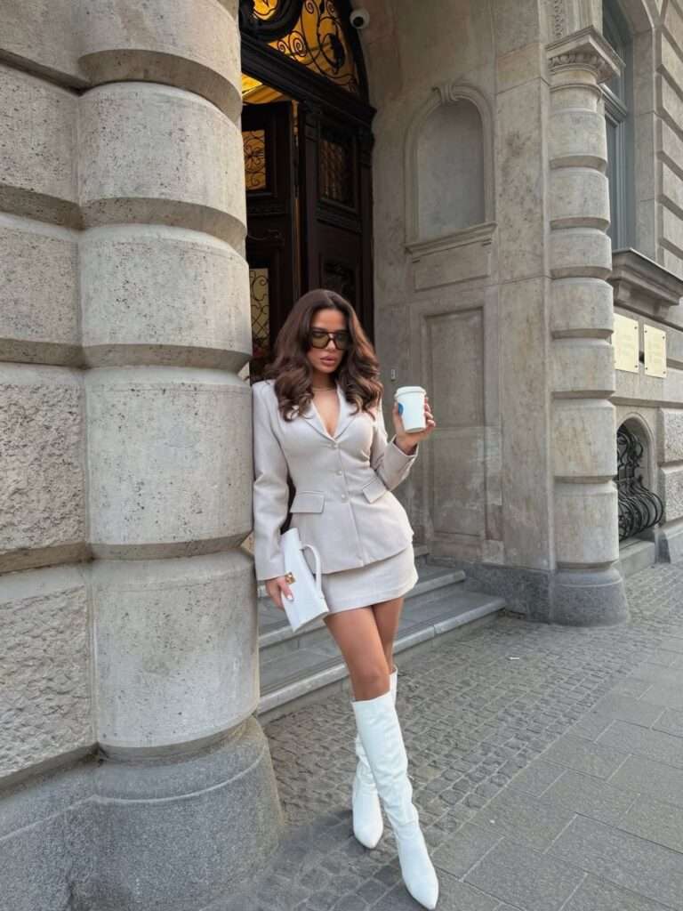 This look has a very strong fashion-editor city vibe. The structured taupe blazer paired with a matching mini skirt creates a sharp silhouette, and the white knee-high boots give it a confident, statement finish. The white clutch keeps the palette light and clean, which works especially well for early spring styling. This is one of those outfits that feels bold, feminine, and very put-together at the same time.