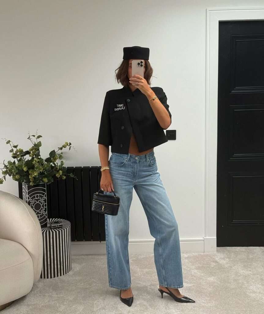 This outfit has a cool, slightly editorial feel that makes it stand out right away. The cropped black short-sleeve jacket paired with light-wash straight-leg jeans creates an interesting mix of tailored and casual elements. Accessories like the black structured mini bag, pointed slingback heels, and matching black hat give it a stronger personality. It is modern, a little unexpected, and perfect for someone who likes spring outfits with a fashion-girl edge.