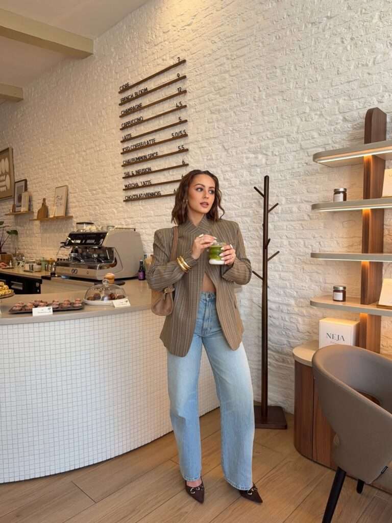 This is a great example of how to make casual denim feel sophisticated. The brown pinstripe blazer adds structure and a slightly vintage-inspired mood, while the light jeans keep the outfit relaxed and daytime-friendly. The pointed brown shoes, shoulder bag, and jewelry finish the look without making it feel overstyled. It feels like the perfect spring coffee-date outfit for someone who loves neutral tones with a tailored twist.