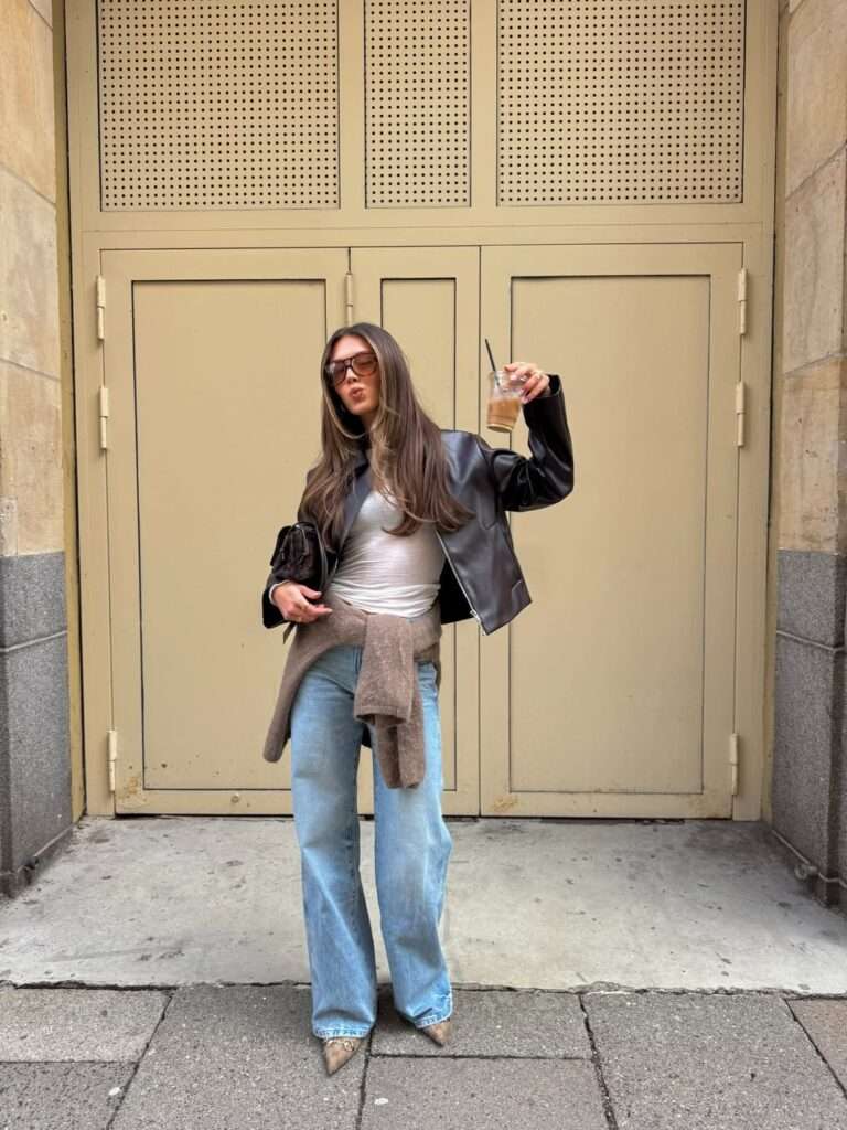 This outfit feels effortless in the best way. The cropped black leather jacket adds edge, the light gray fitted top softens the contrast, and the loose light-wash jeans keep the overall mood relaxed and current. Tying the taupe knit around the waist gives the look more dimension while also making it feel casual and lived-in. It is the kind of off-duty spring outfit that works because every piece feels easy, cool, and naturally styled.