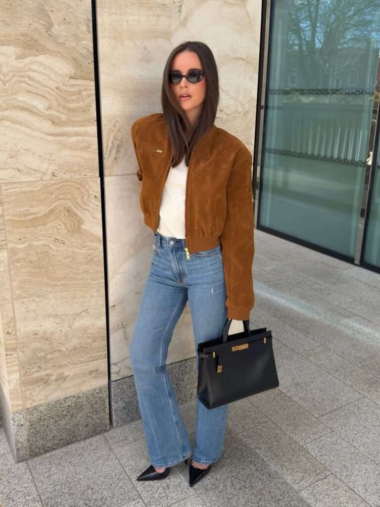 This outfit mixes casual basics with rich textures in a really smart way. The brown suede jacket brings warmth and depth, while the white fitted top and light-wash jeans keep the outfit grounded and easy to wear. The black pointed heels and structured black handbag make it feel more elevated than a typical denim look. It is a perfect example of how to make jeans feel polished in spring without losing comfort.