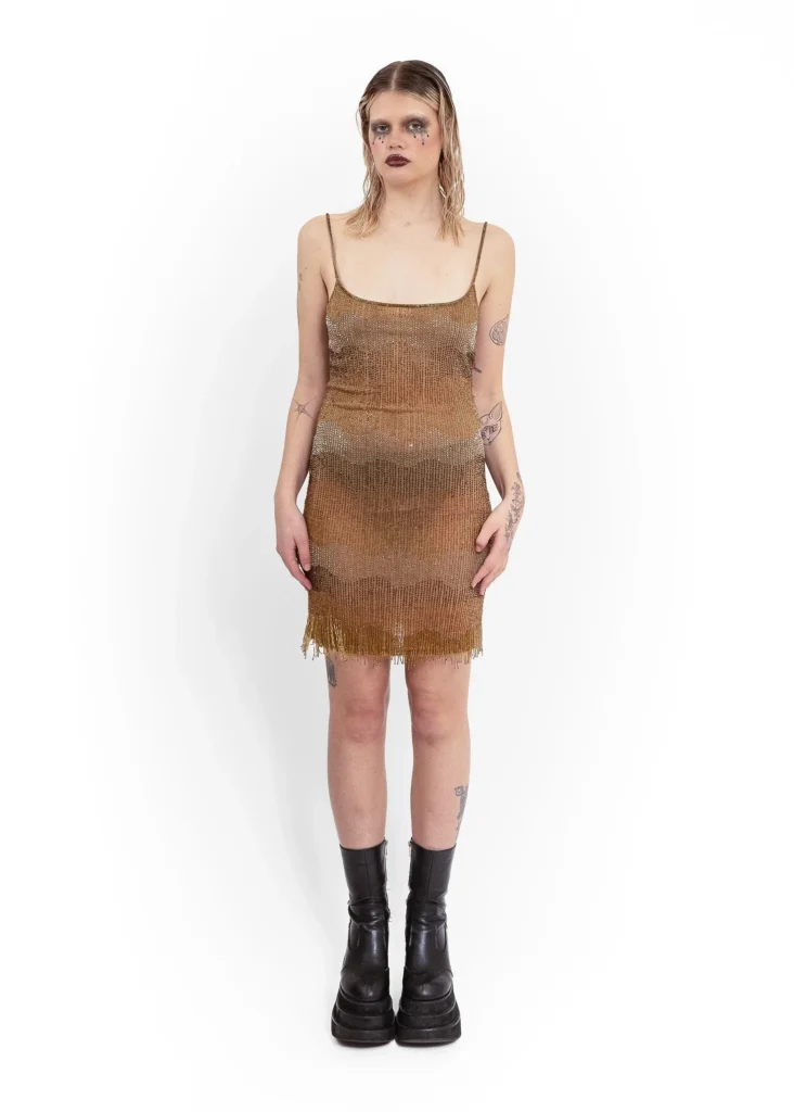This look brings in pure 90s party energy with a shimmering gold beaded mini dress and fringe at the hem. The thin straps and body-skimming fit feel very vintage, while the chunky black platform boots give it that darker, slightly rebellious edge. It is the kind of outfit that looks made for a retro club night, a concert, or a statement fashion shoot.