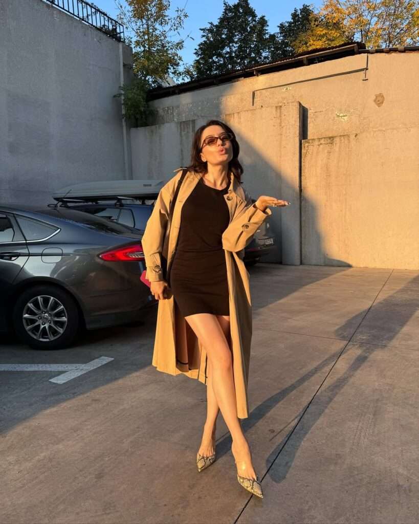 This outfit channels that city-ready 90s night-out style with a fitted black mini dress and a long neutral trench. The sharp pointed heels add a dressier finish, while the trench keeps the whole look grounded and classic. It is simple, flattering, and exactly the kind of outfit that always comes back in fashion.