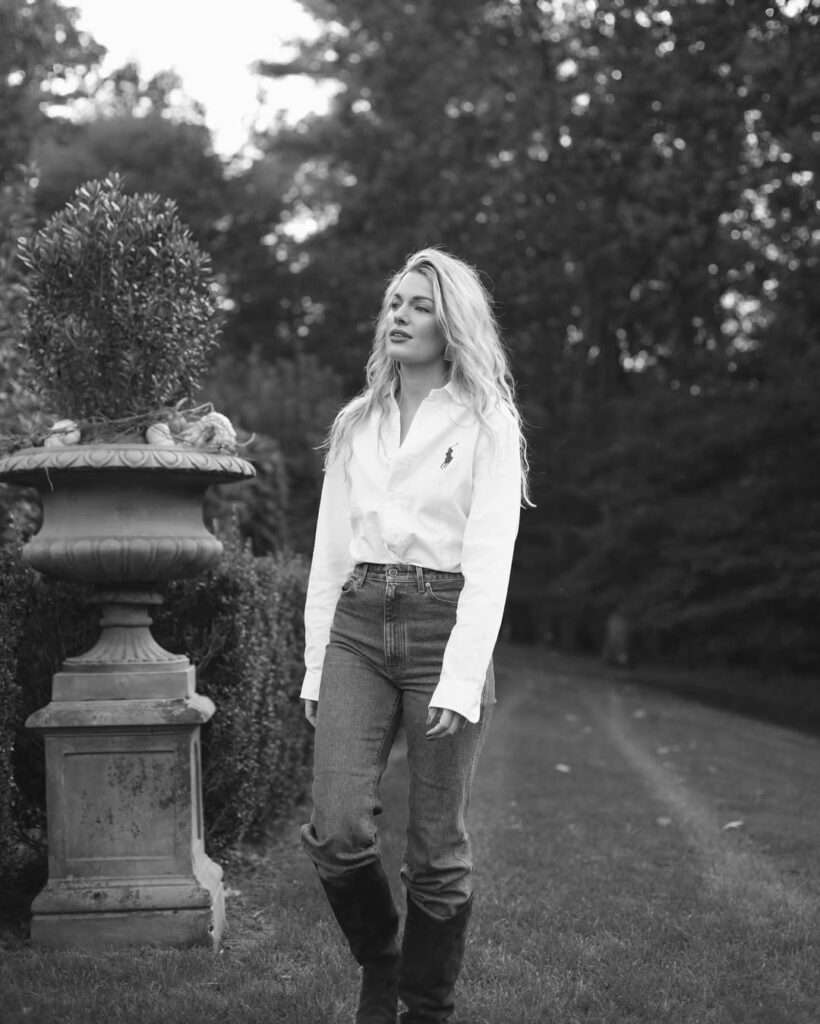 A white button-down tucked into jeans is one of the easiest ways to recreate classic 90s American style. The tall boots add structure and make the whole outfit feel more confident and polished. Even in a simple color palette, this look stands out because it relies on strong basics and timeless proportions.