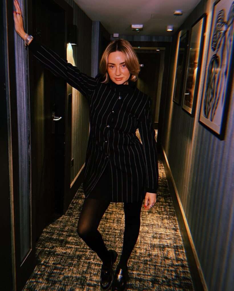 A pinstripe blazer dress is one of the strongest power pieces in this lineup. The fitted shape, dark palette, and black tights make it feel bold, polished, and slightly dramatic in a very 90s way. Loafers keep it grounded and wearable, which makes the outfit feel stylish without being overdone.