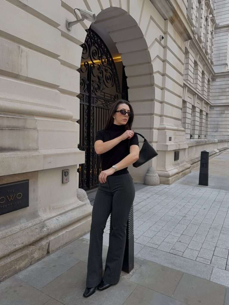 This outfit leans into sleek late-90s minimalism with a fitted black top and dark pinstripe pants. The long line of the trousers makes the whole look feel polished, especially with pointed black shoes and a shoulder bag. It is the kind of outfit that looks clean, confident, and a little bit corporate in the chicest way.