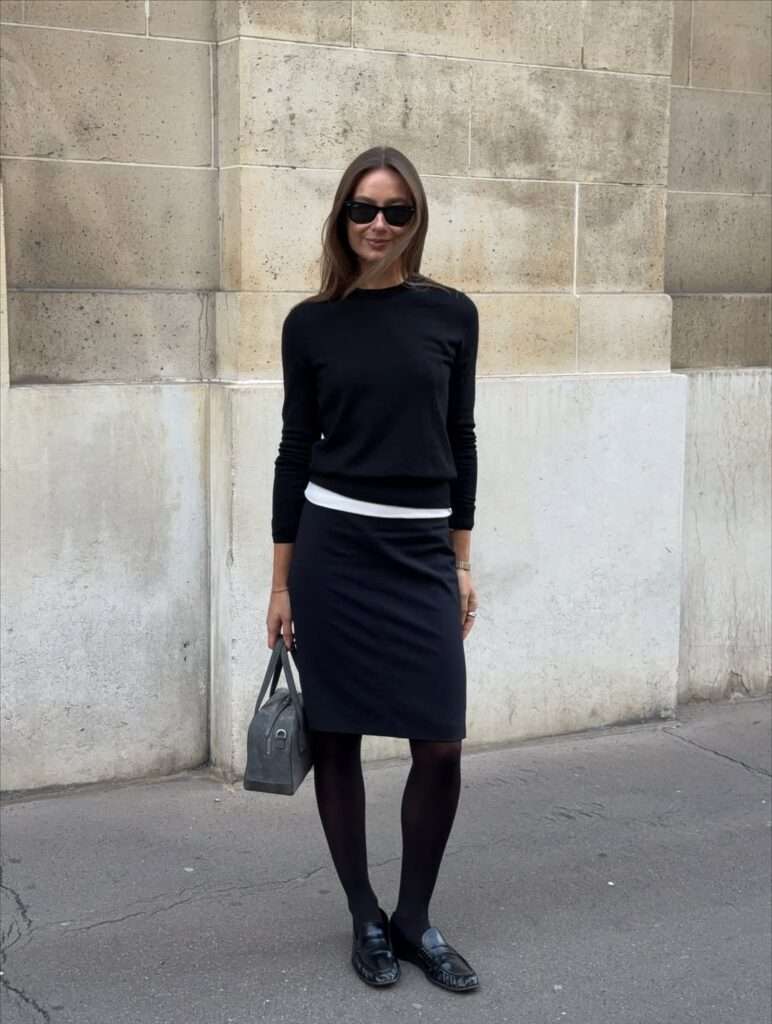 A fitted black sweater with a sleek pencil skirt creates a clean silhouette that feels straight out of a 90s minimalist wardrobe. The visible white layer at the hem adds a little contrast and keeps the outfit from looking too flat. With black tights, loafers, and a structured handbag, this look is elegant, smart, and timeless.