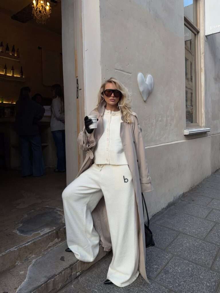 The monochrome knit set gives this outfit a soft, luxe feel, while the oversized trench adds that relaxed 90s outerwear shape. Even though the palette is light and modern, the volume and proportions keep it rooted in retro styling. Oversized sunglasses and black accents finish the look with a cool, elevated touch.