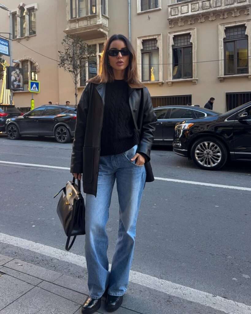 This look captures that effortless 90s model-off-duty energy with a black leather jacket, a dark knit sweater, and relaxed light-wash jeans. The silhouette is simple, but the oversized outerwear and clean black accessories give it a strong retro attitude. It is one of those outfits that feels cool without trying too hard, especially with the slim sunglasses and structured bag.