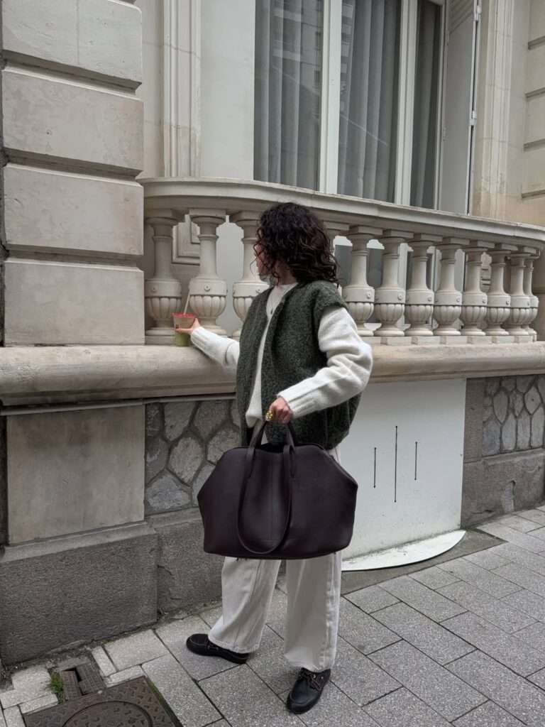 This look takes a quieter approach to retro dressing with soft cream basics layered under a textured dark vest. The roomy pants and oversized bag give it that relaxed, slightly intellectual feel that was common in understated 90s fashion. It is comfortable, practical, and perfect for anyone who likes vintage-inspired neutrals.