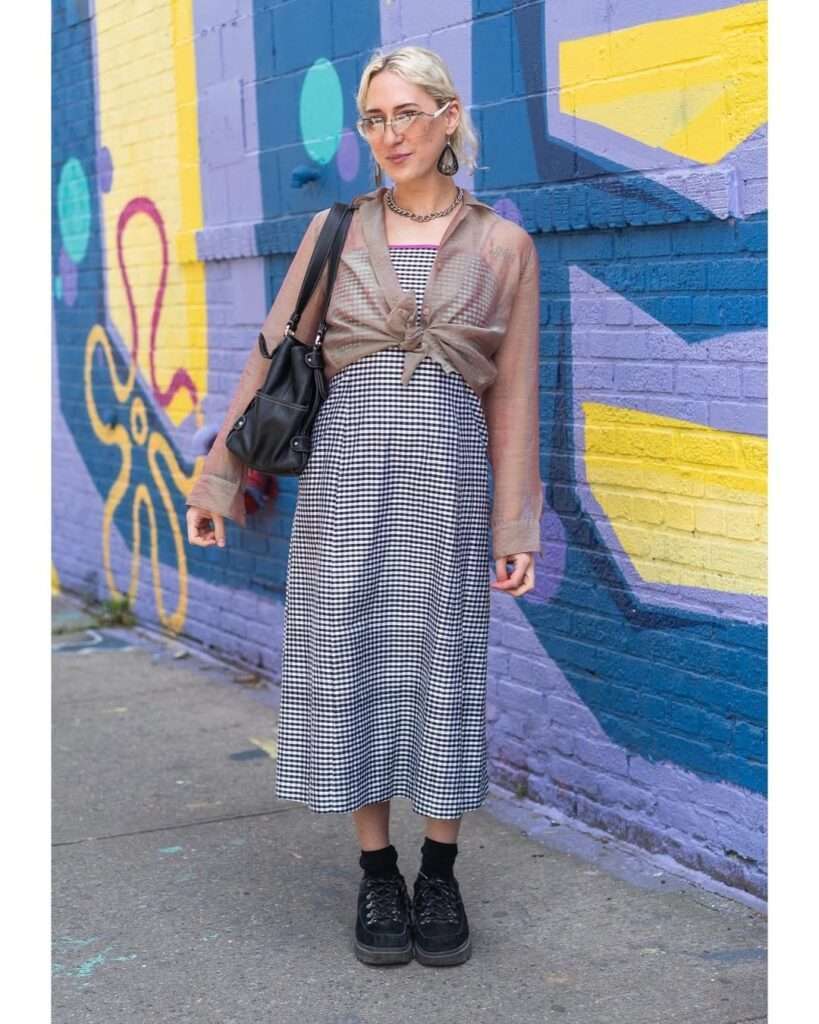 This look has a charming vintage feel thanks to the black-and-white gingham dress and sheer tied blouse layered over it. The styling feels a little thrifted, a little artsy, and very in tune with the playful side of the 90s. Black sneakers and simple accessories keep it casual and wearable instead of overly dressed up.