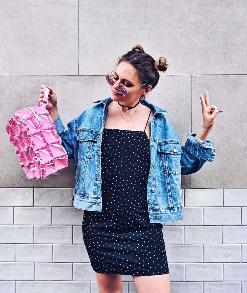 An oversized denim jacket thrown over a playful printed mini dress is such a classic 90s combination. The colorful bag, choker, and tinted sunglasses give the outfit a more youthful and pop-inspired vibe. This look feels fun, nostalgic, and perfect for anyone who loves the louder, more experimental side of retro fashion.