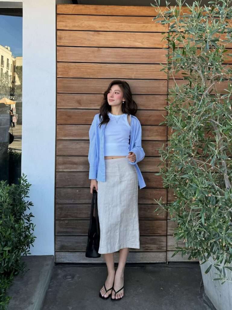 This outfit has a lighter, softer take on 90s fashion with a pastel blue tank, an open striped shirt, and a neutral midi skirt. The easy layering gives it that relaxed everyday charm that was everywhere in casual 90s styling. Paired with simple sandals and a black tote, it feels fresh, understated, and very wearable.
