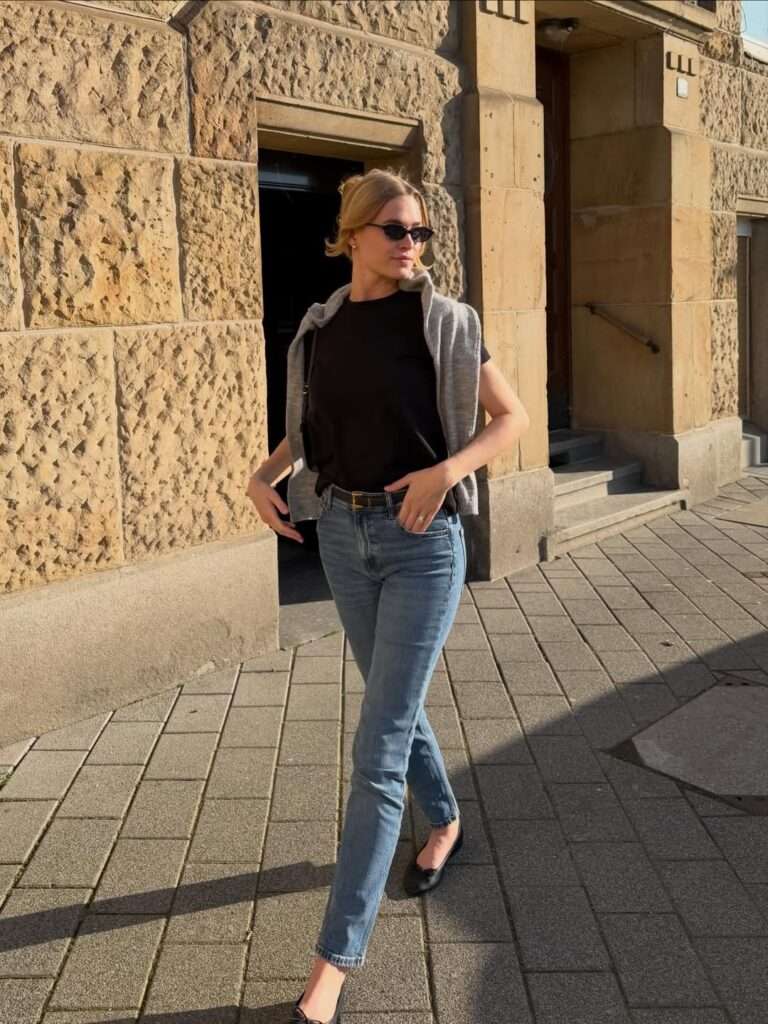 This outfit proves how effective simple 90s styling can be when the basics are right. A black tee with straight blue jeans already feels classic, but the sweater draped over the shoulders adds a subtle preppy twist. With slim sunglasses and ballet flats, it becomes an easy daytime look that feels effortless and refined.
