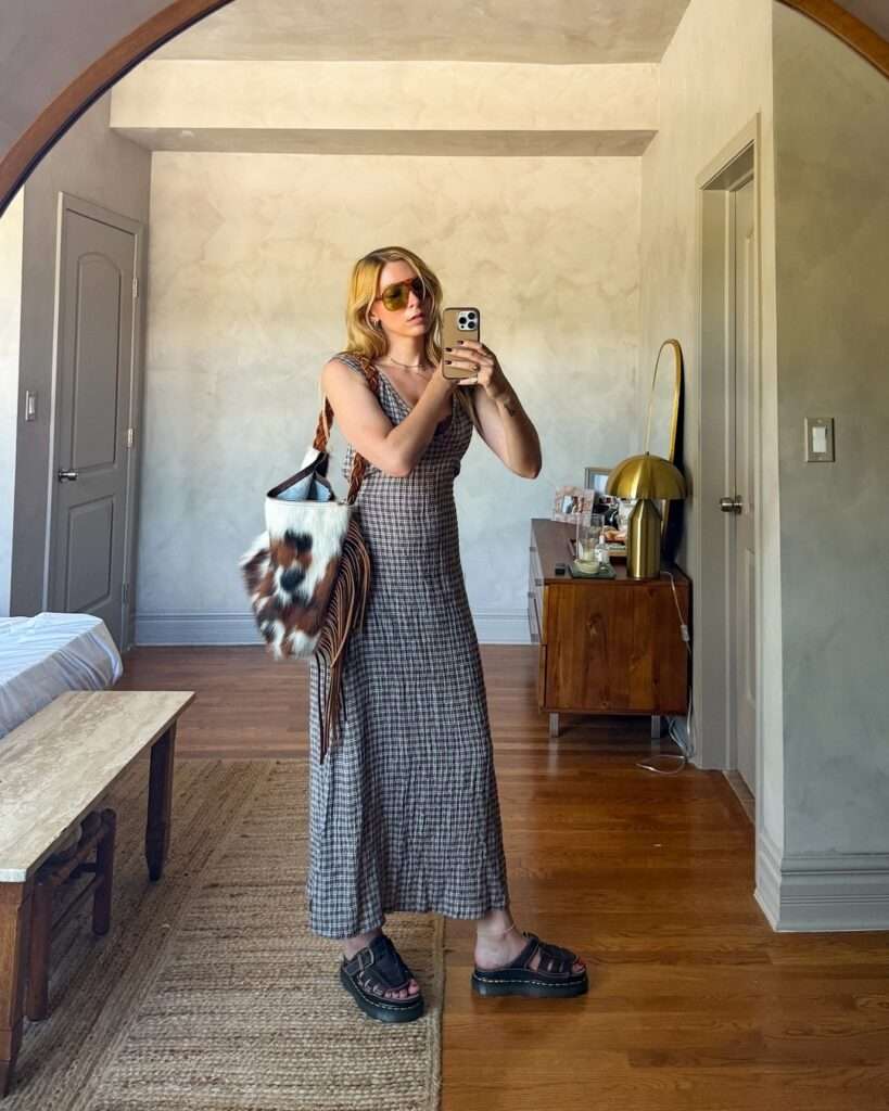 This dress has a strong 90s grunge-meets-boho feel, especially when paired with chunky sandals and oversized sunglasses. The patterned fabric and easy silhouette make it feel vintage, while the furry statement bag adds personality and texture. It is a great example of how 90s fashion often mixed quirky accessories with simple shapes.