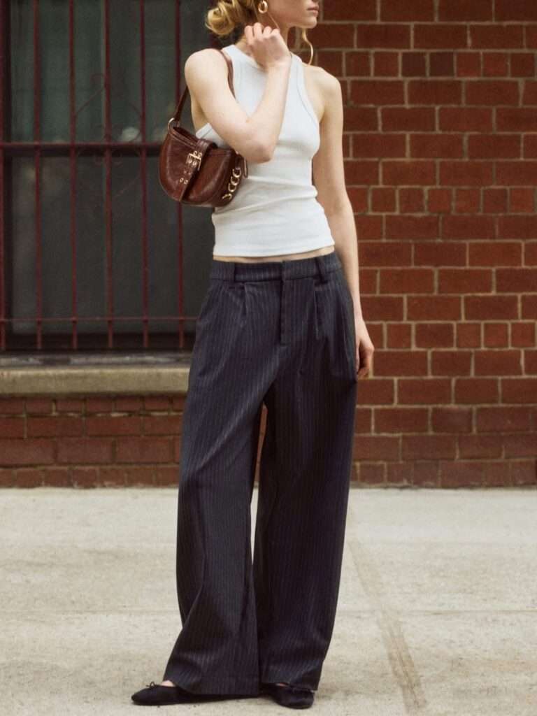 This outfit blends late-90s and early-2000s influence with a fitted white halter and loose pinstripe trousers. The low-slung feel of the pants gives it that unmistakable retro attitude, while the small brown shoulder bag adds a perfect vintage touch. It feels cool, relaxed, and styled in a way that still looks current today.