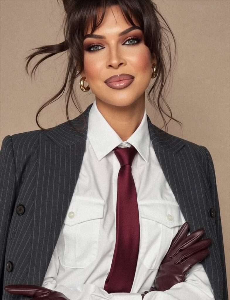 A pinstripe blazer over a crisp white shirt instantly brings in classic 90s power dressing. The burgundy tie and matching gloves make the outfit feel bold, polished, and a little dramatic in the best way. This is a strong retro look for anyone who loves vintage office style, editorial fashion, or that sharp masculine-feminine balance.