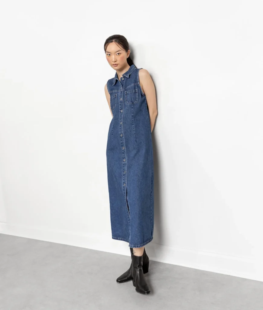 This denim button-front dress is a perfect example of how 90s fashion made casual pieces feel stylish and cool. The structured collar and long straight silhouette give it a utility-inspired vibe, while the black ankle boots add just enough contrast. It is simple, wearable, and ideal for anyone who loves vintage denim without going too casual.