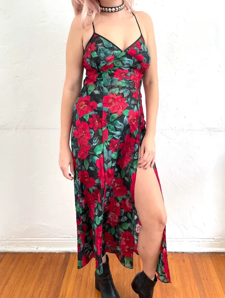This floral slip dress feels like a classic 90s grunge-meets-feminine outfit, especially with the black boots and choker. The red floral print, side slit, and delicate straps keep it soft and flattering, while the darker accessories add attitude. It is a strong retro look for anyone who wants that iconic 90s balance between romantic and edgy.