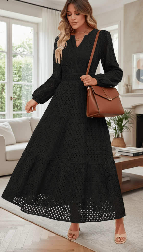 The final look brings texture and grace with an eyelet-style black maxi dress that feels airy yet refined. The long sleeves and defined waist create a flattering silhouette, while the fuller skirt gives the outfit movement and softness. A brown structured handbag adds warmth and makes the styling feel more seasonal and grounded. This is a beautiful black maxi dress idea for family gatherings, daytime events, or a polished casual-chic look, especially if you enjoy timeless feminine pieces like the looks in Shoulder Length Hair and Mid Length Trench Coat Outfit.