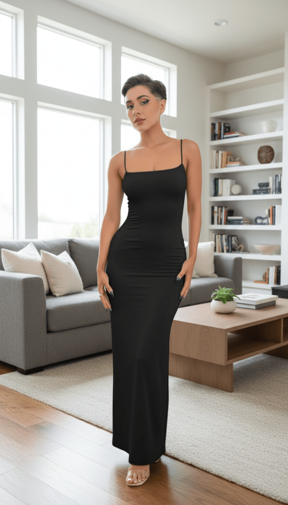 The ninth look proves that sometimes the cleanest outfit is the most striking. This strappy black maxi dress has a very minimal shape, but the fitted cut gives it a strong presence. With no heavy layering or bold accessories, the dress feels easy, modern, and quietly confident. It would work especially well for summer evenings at home, casual dinner plans, or minimalist everyday styling.