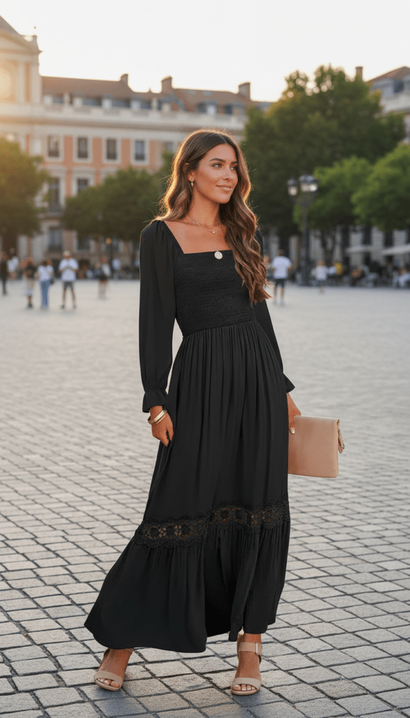 The fifth look feels soft, classic, and easy to wear thanks to the smocked bodice and flowy skirt. Long sleeves make it feel a little more modest and graceful, while the lace detail near the hem adds a subtle romantic finish. Styled with layered necklaces, a neutral clutch, and block heels, the outfit feels balanced and practical without losing elegance. This is the type of black maxi dress outfit that works beautifully for dinner outdoors, city exploring, or even casual events.