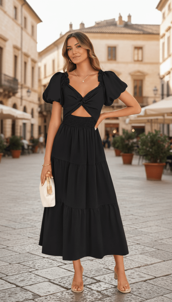 This outfit adds a more playful and feminine twist with puff sleeves, a front knot detail, and a small waist cutout. The tiered skirt gives the dress movement, which makes it feel more relaxed and daytime-friendly than the fitted evening styles. A small white bag brightens the outfit and adds contrast against the black fabric in a very clean way. It is a great choice for brunch, vacation walks, or a stylish afternoon in an old-town setting.